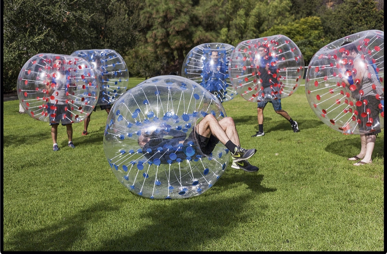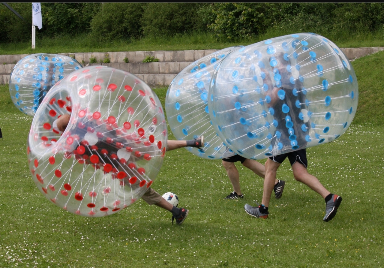 Wenn Sie bei uns Bubble Soccer mieten, bieten Sie den Mitspielern ein ganz besonderes Erlebnis. Oberkörper und Kopf stecken in den aufblasbaren, transparenten Bumper Balls, die einen bei den obligatorischen Aufprallen schützen. Der Begriff „Ballkontakt“ erhält beim Bubble Soccer eine ganz neue Bedeutung. Der Ball wird wie beim Fußball gespielt. Ziel ist es, mehr Tore zu erzielen als der Gegner – und die Spieler stecken selbst in Bällen, mit denen sie versuchen, den Gegenspieler durch das sogenannte „Bumpen“ umzuschubsen. Wer auf dem Boden liegt, muss wie ein Käfer auf dem Rücken zunächst kämpfen, um wieder auf die Füße zu kommen – ein Riesenspaß für Teilnehmer und Zuschauer.