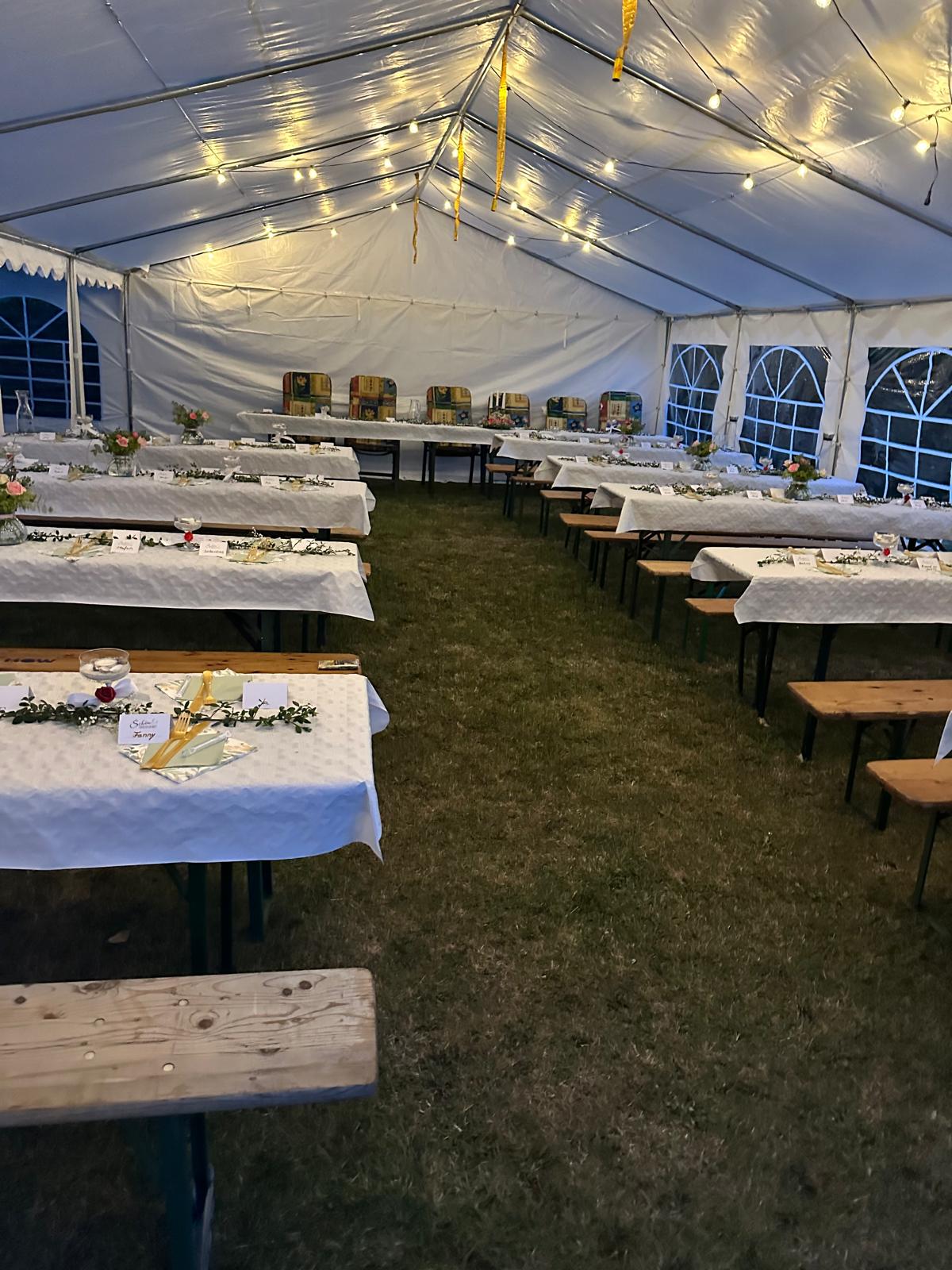 Mit praktischem Zubehör wie Tischen, Stühlen, Beleuchtung und Dekorationen gestalten wir Ihre Feier nicht nur funktional, sondern auch stilvoll.